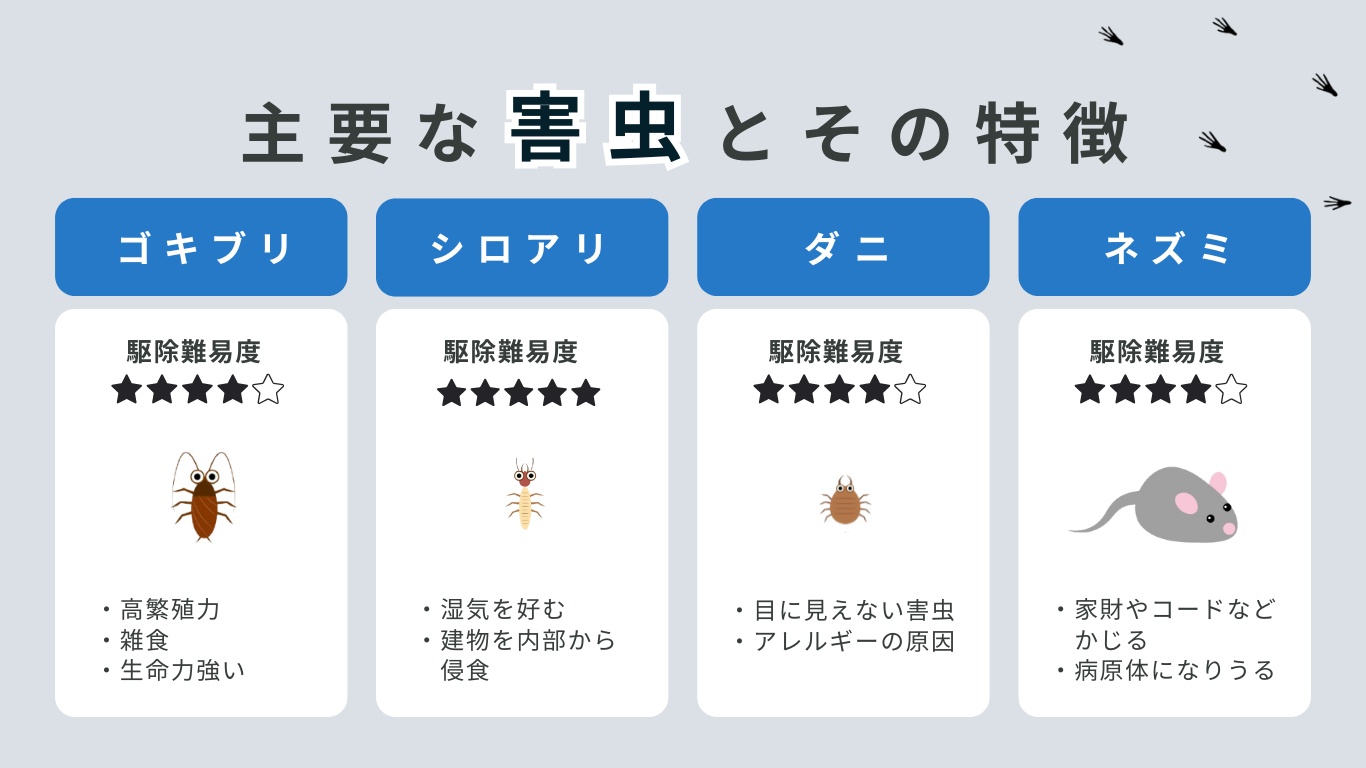 害虫や害獣は小さい生き物ですが、人間の私たちの健康や安全を脅かす存在です。見つけたのは数匹だけど、どこかに隠れて巣を作っているのかもしれません。